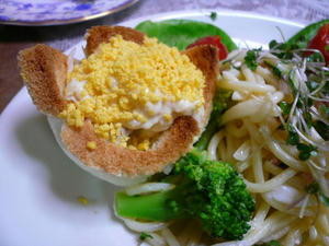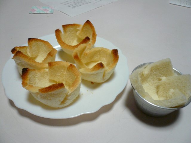 サンドウィッチ用のパンを、プリン型にいれて焼いておきます。