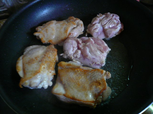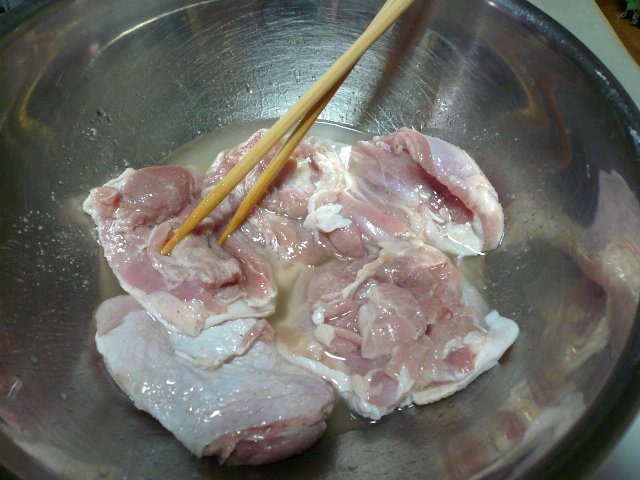 レモン汁につけておいたチキンをやきます。
