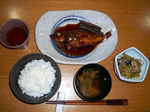 メニューは、煮魚とキャベツとたまねぎの酢醤油漬け